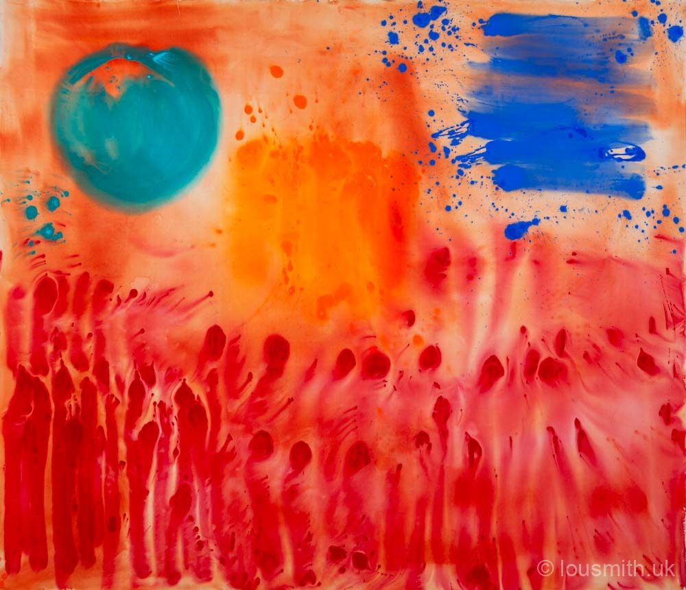Lou Smith’s paintings are large scale dynamic abstract colour paintings. Lou walks into the centre of the canvas to create marks in response to colour, surface, texture and emotional resonance. The paintings transcend everyday reality as Lou uses mark making as a fundamental aspect of abstract painting, contributing to the overall expression, texture, and visual language of a work of art. She involves the intentional application of various marks, strokes, lines, and gestures to create a unique and personal visual vocabulary.